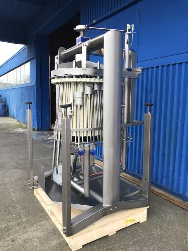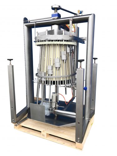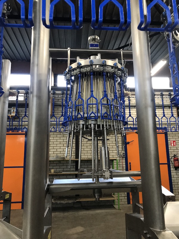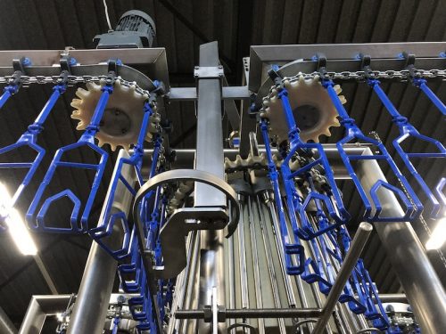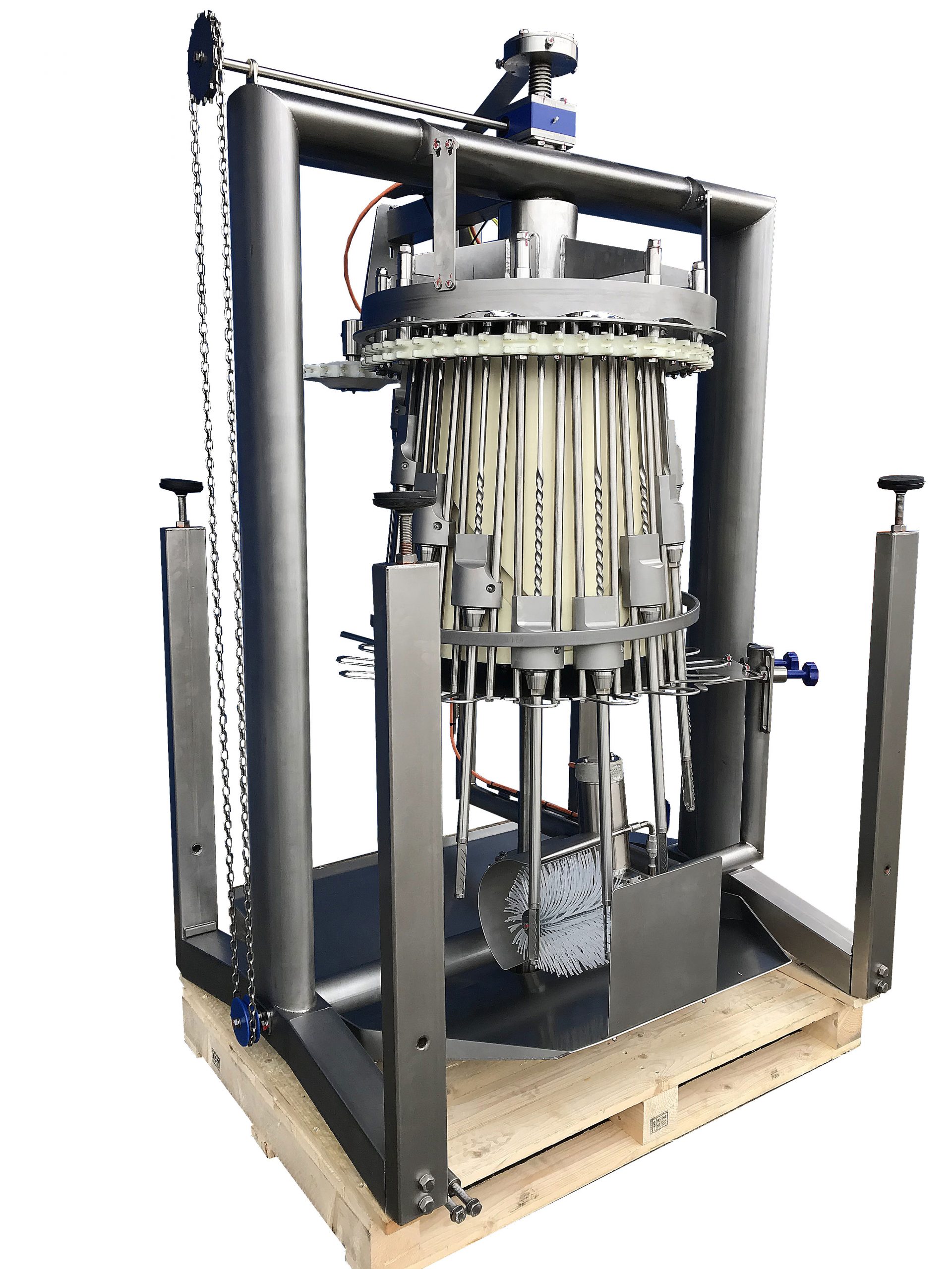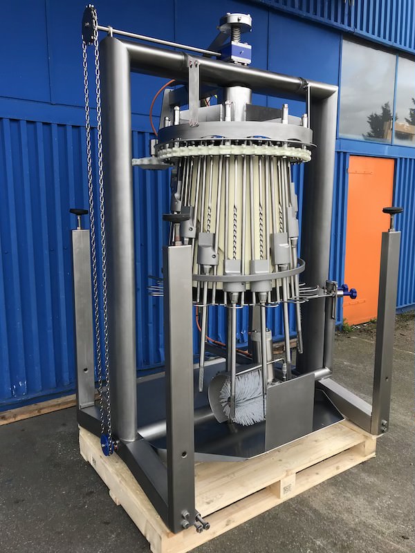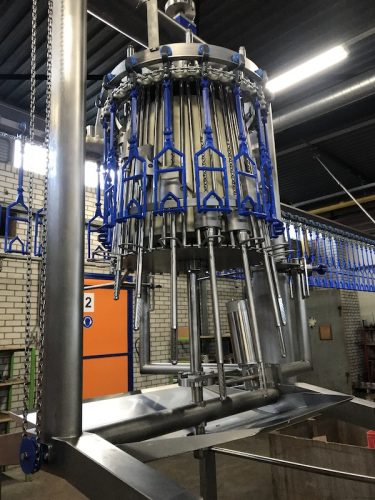 The automatic cropping machine is designed to remove the crop (rests), trachea (windpipe) and oesophagus from birds as part of an automatic evisceration line. The birds are correctly positioned by guides. Stainless steel rotating drilling units enter the cavity to remove any remaining parts of the crop. The drill will be cleaned by a rotating brush before leaving the cavity again. The cropper drill driving mechanism leads to reduced mechanical wear and extended drill life cycle.