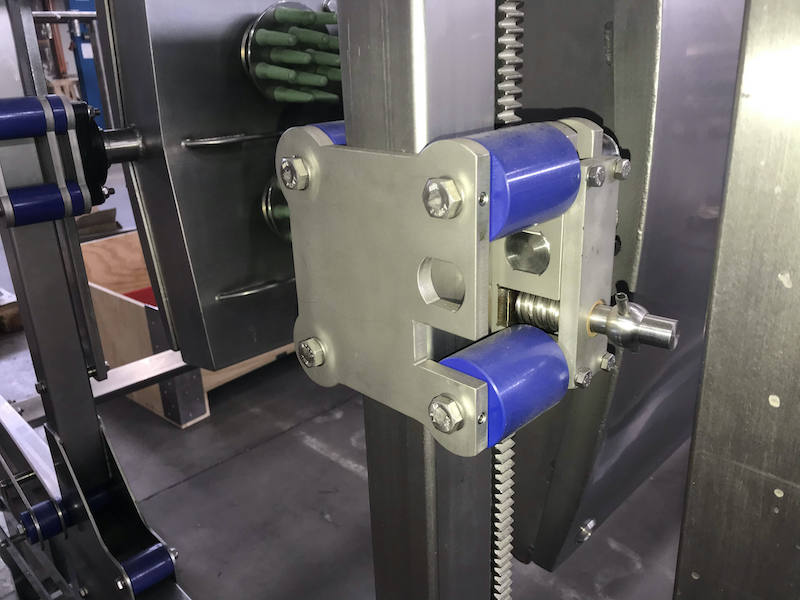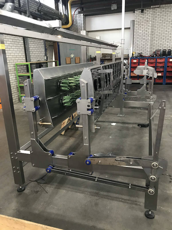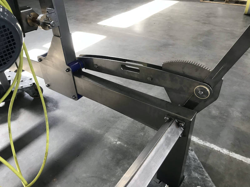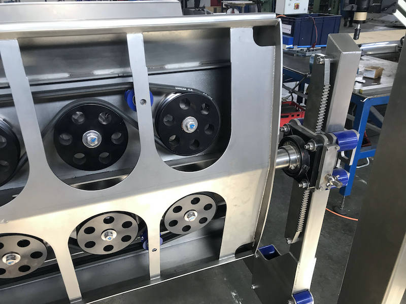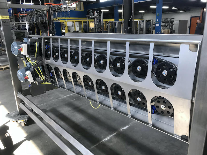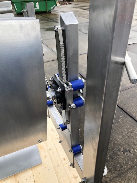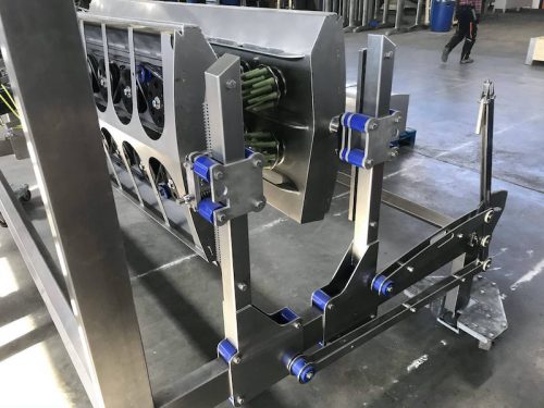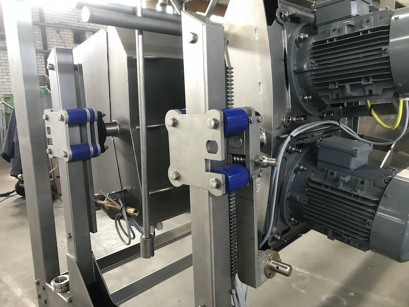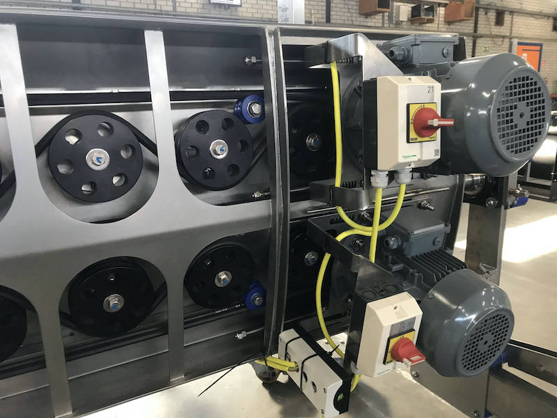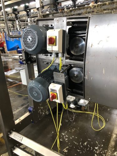 The machine consists of two plucking cabinets which contain V-belt-driven stainless steel rotating discs holding rubber picking fingers