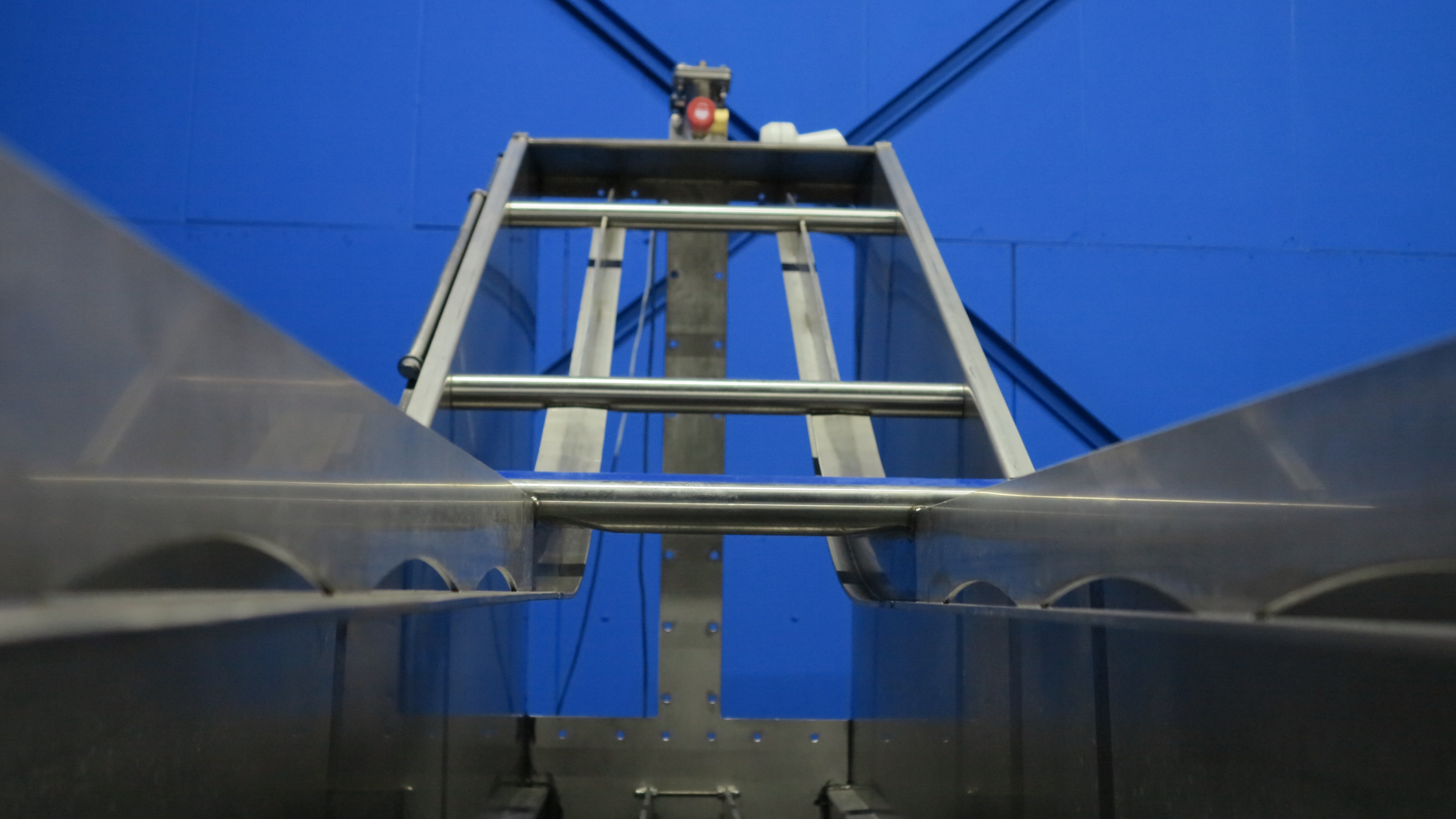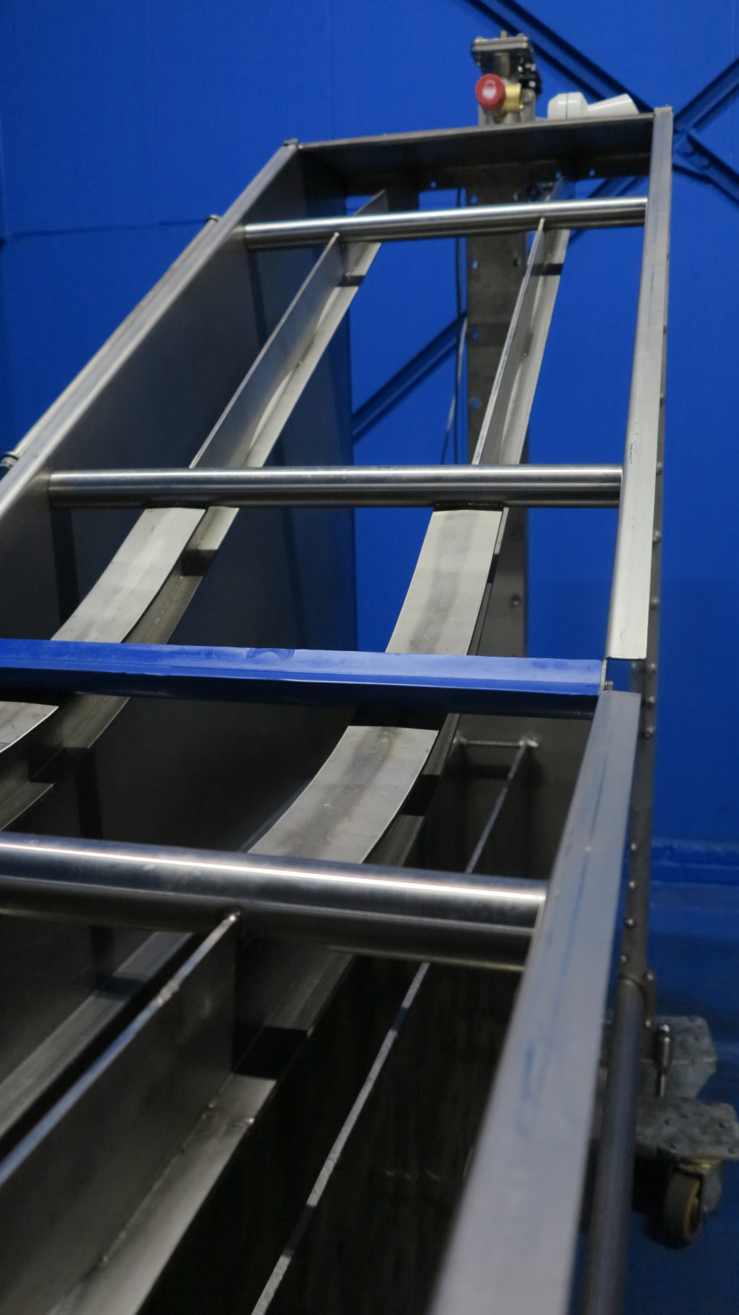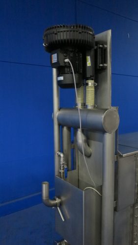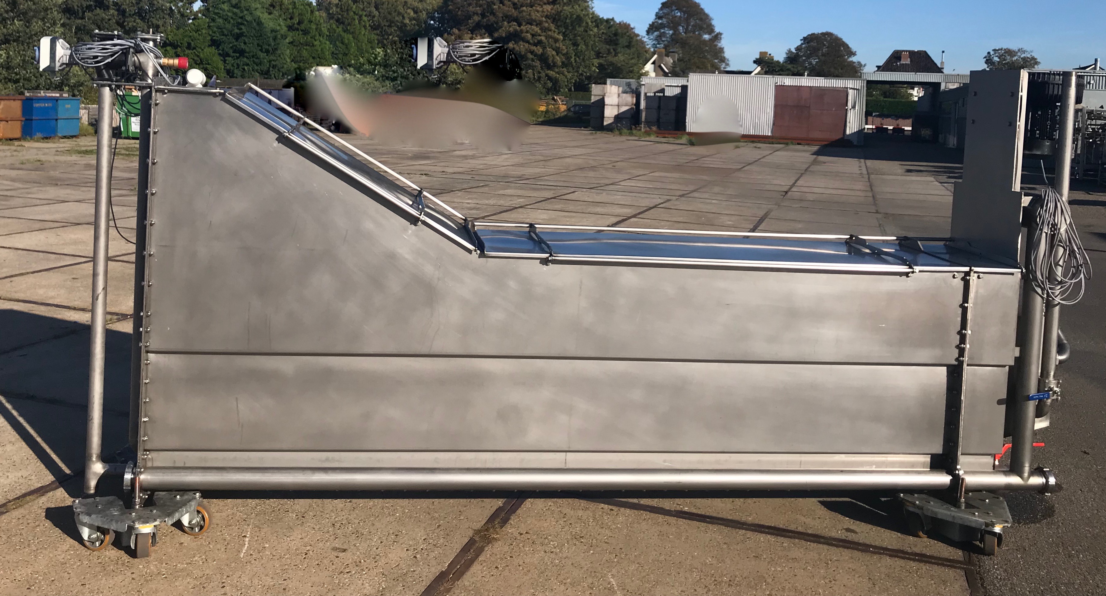 Before plucking and after the birds have bled out, the birds are conveyed through a water tank filled with hot, scalding water. Hence the name of the machine: scalder or scalding tank. The water is be heated by heating elements and functions to open the pores, help loosen the feathers from the skin. Blowers inside the tank will create turbulence in the water, meaning the birds are completely immersed and scalded.
