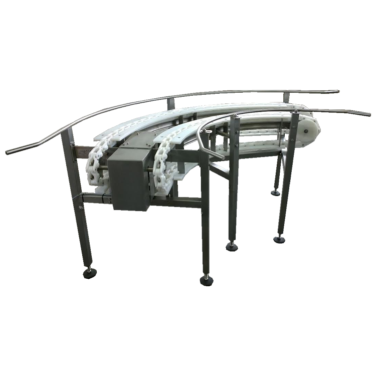 Nylon Chain Conveyor (90 degree) Ideal for transporting live bird crates 90° curve Standard width of 700 mm Made of stainless steel and food industry approved nylon chains Gear motor drives nylon chain With leveling feet for easy height adjustment Model: 90 degree curve crate conveyor Quantity: Add to Quote View details View specifications Datasheet & Quotation Nylon chain conveyor for transporting crates within the live bird handling (arrival) area of a poultry processing plant. Straight or 90 degrees curved sections. Including drive/tensioning unit. Straight sections sold in standard length of 5000 mm per section. Standard width 700 mm, other widths available on customer request. Height according to customer requirements. With leveling feet for stabilization and to adjust the height of the machine. Made of stainless steel, food grade nylon and other non-corrosive materials. Open 90 degree curve crate conveyor011.0004Width700 mm (standard width, other sizes on customer request)HeightAdjustable with leveling feet, according to customer requirementsInstalled power0.37 kW Download
