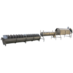 Before plucking and after the birds have bled out, the birds are conveyed through a water tank filled with hot, scalding water. Hence the name of the machine: scalder or scalding tank. The water can be heated by heating elements and functions to help loosen the feathers from the skin. This is absolutely vital to achieve a good defeathering result. Blowers inside the tank will create turbulence in the water, meaning the birds are completely immersed and scalded.
