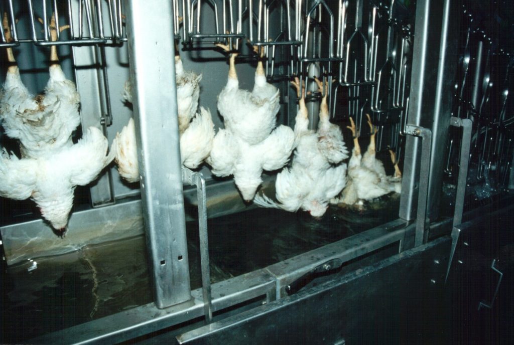 Stunning by waterbat is a widely used method. It entails creating an electrical circuit by wetting the birds head. The electric stun will immobilize the birds and cause them to loose consciousness before they are killed. Immobilization has an added positive effect that it allows for clean, efficient and consistent killing cuts, meaning birds will not be harmed or hurt unnecessarily. Killing is then done by hand using a knife or by an automatic machine with one rotating blade.